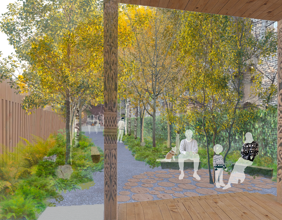 Cleanup and landscaping of the parcel to establish a green space with seating areas, gardens, and pathways.